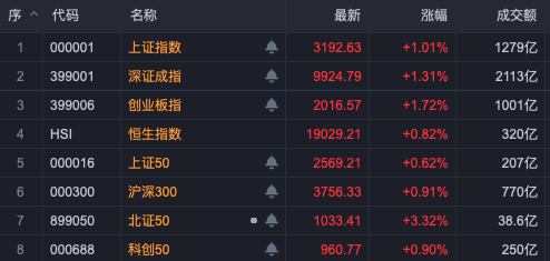 1月14日,三大指数开盘均高涨。收尾发稿,沪指、深证成指、创业板指均涨超1%。香港股市也高开高走,恒生指数也一度涨超1%。