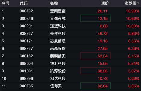 互联网板块走强,壹网壹创20%涨停,吴通控股涨逾11%,六合秀、华扬联众、引力传媒等涨停,凯淳股份、寰宇在线等均大涨。