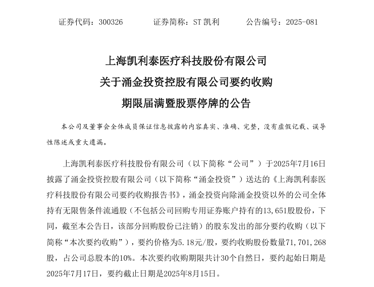 8月17日,ST凯利发布公告,涌金投资控股有限公司于2025年7月16日向公司整体握有无穷售条款流畅股的推动发出了要约收购,价钱为5.18元/股,收购股份数目为7170万股,占公司总股本的10%。本次要约收购的期限为30个当然日,从2025年7月17日运转,到2025年8月15日扫尾。