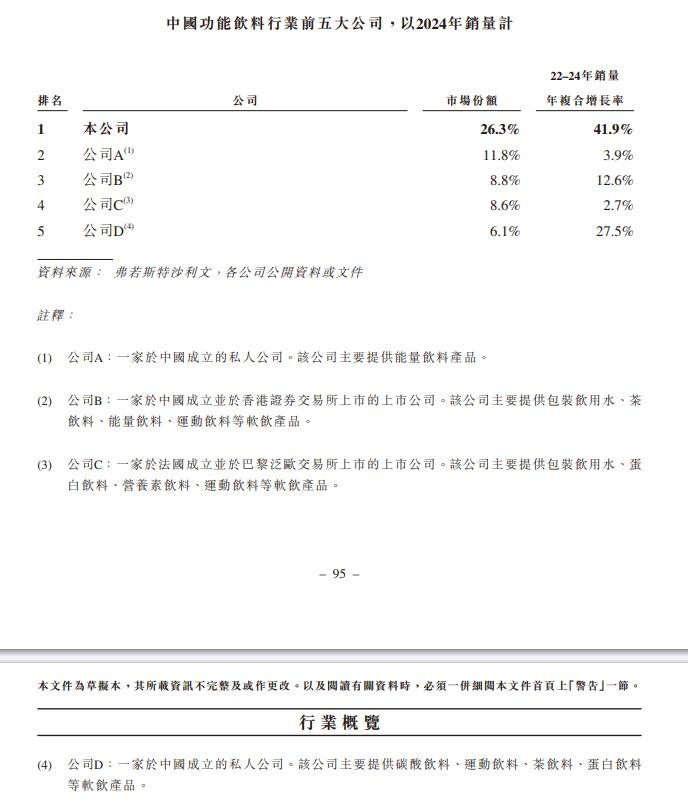 按2024年销量计,中国功能饮料行业前五大公司市集份额系数达到61.6%。东鹏饮料已流通四年排行第一,市集份额从2021年的15.0%增长到2024年的 26.3%,亦然前五名中增速最快的,2022-2024年销量年复合增长率达41.9%。【注:以2024年零卖额计,在中国功能饮料行业中排行第二,市集份额为23.0%】